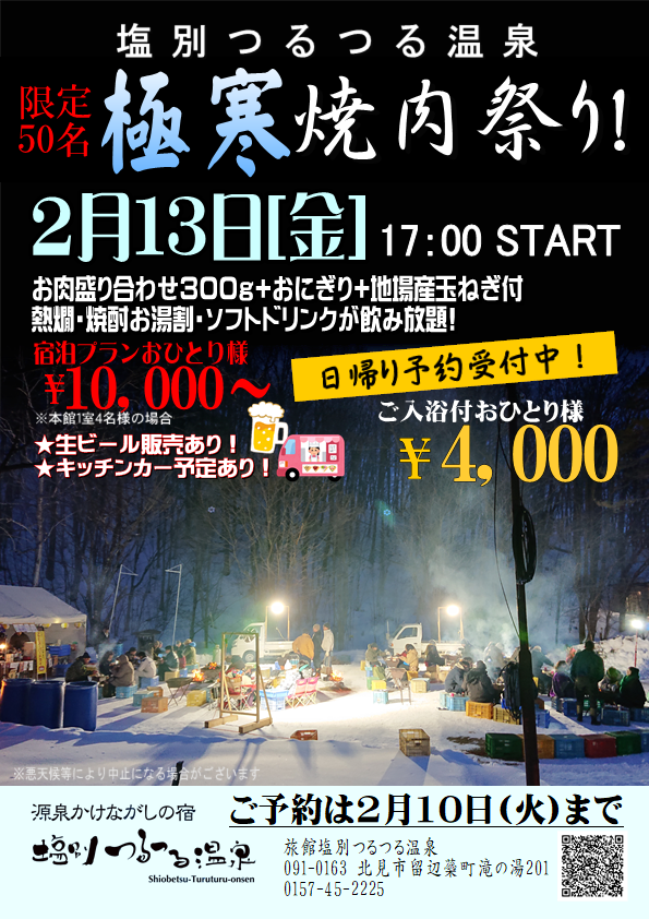 【期間限定】2/17開催★真冬の屋外焼き肉チャレンジ!極寒焼肉プラン<2食付>