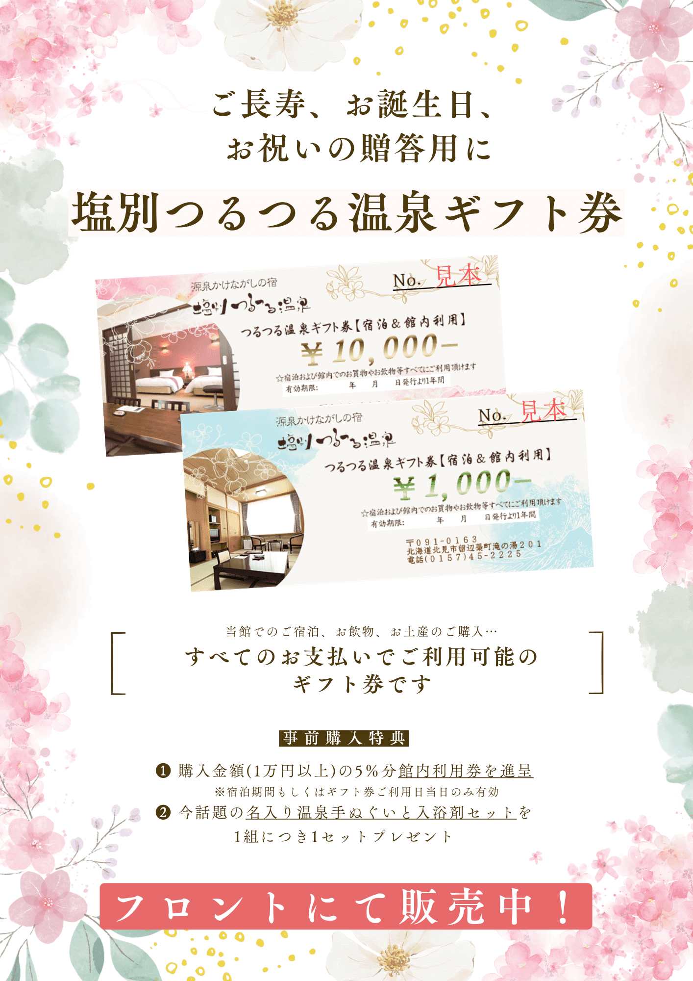 塩別つるつる温泉でご利用いただける『ご宿泊ギフト券』を新しく販売しております。