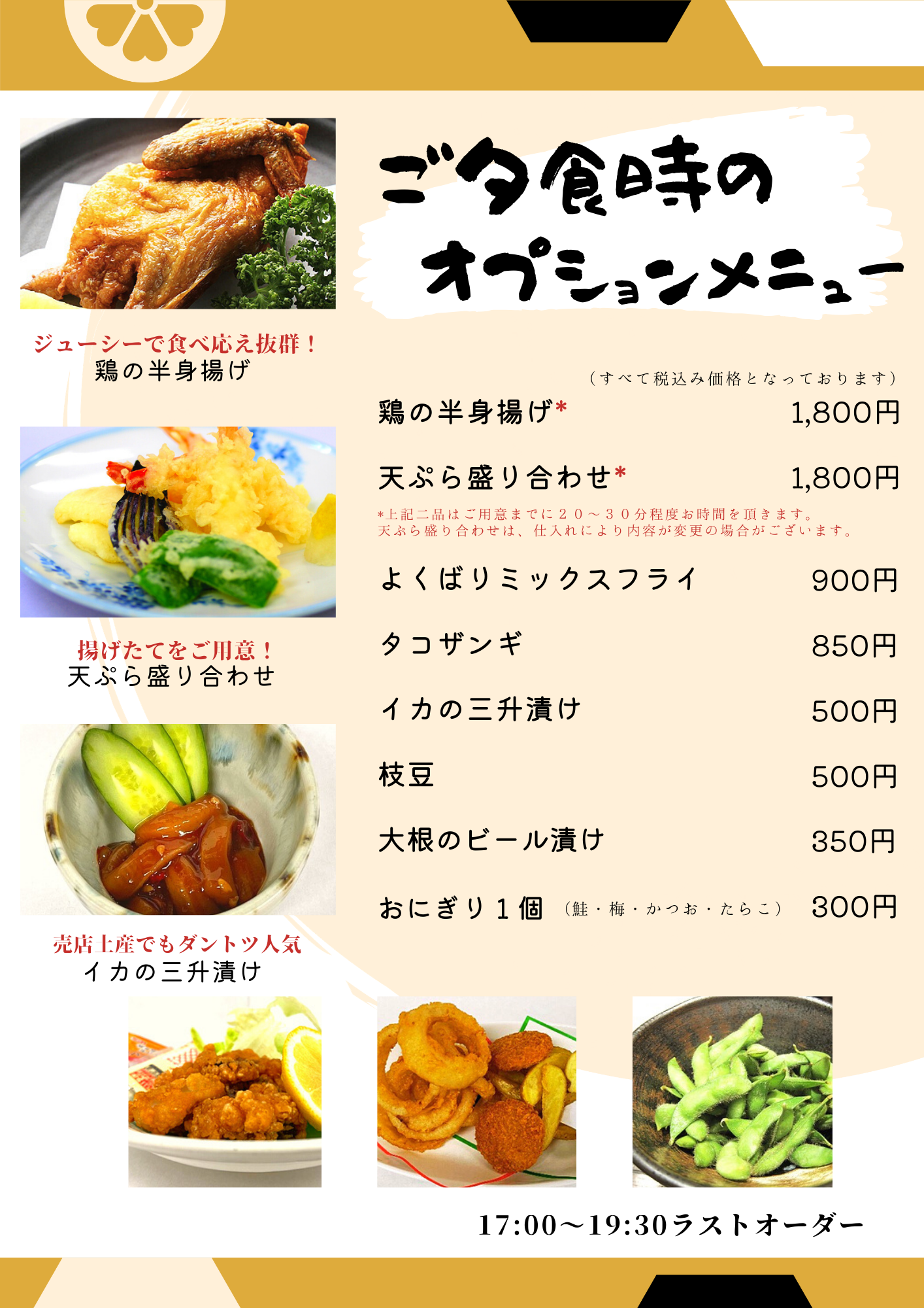 お仕事終わりの一杯とお楽しみください。※当プランは「揚物」のご提供はございませんのでご了承ください。